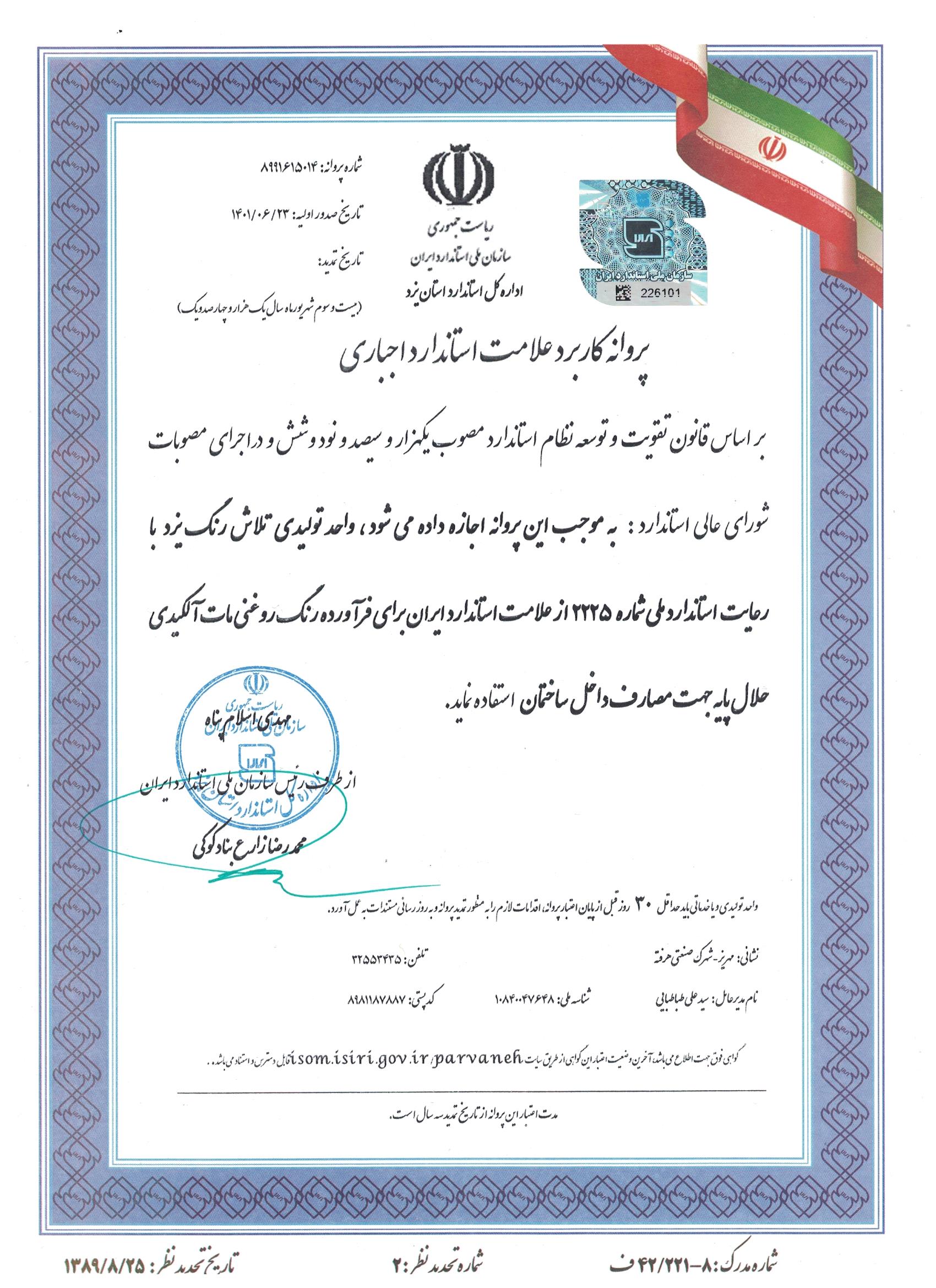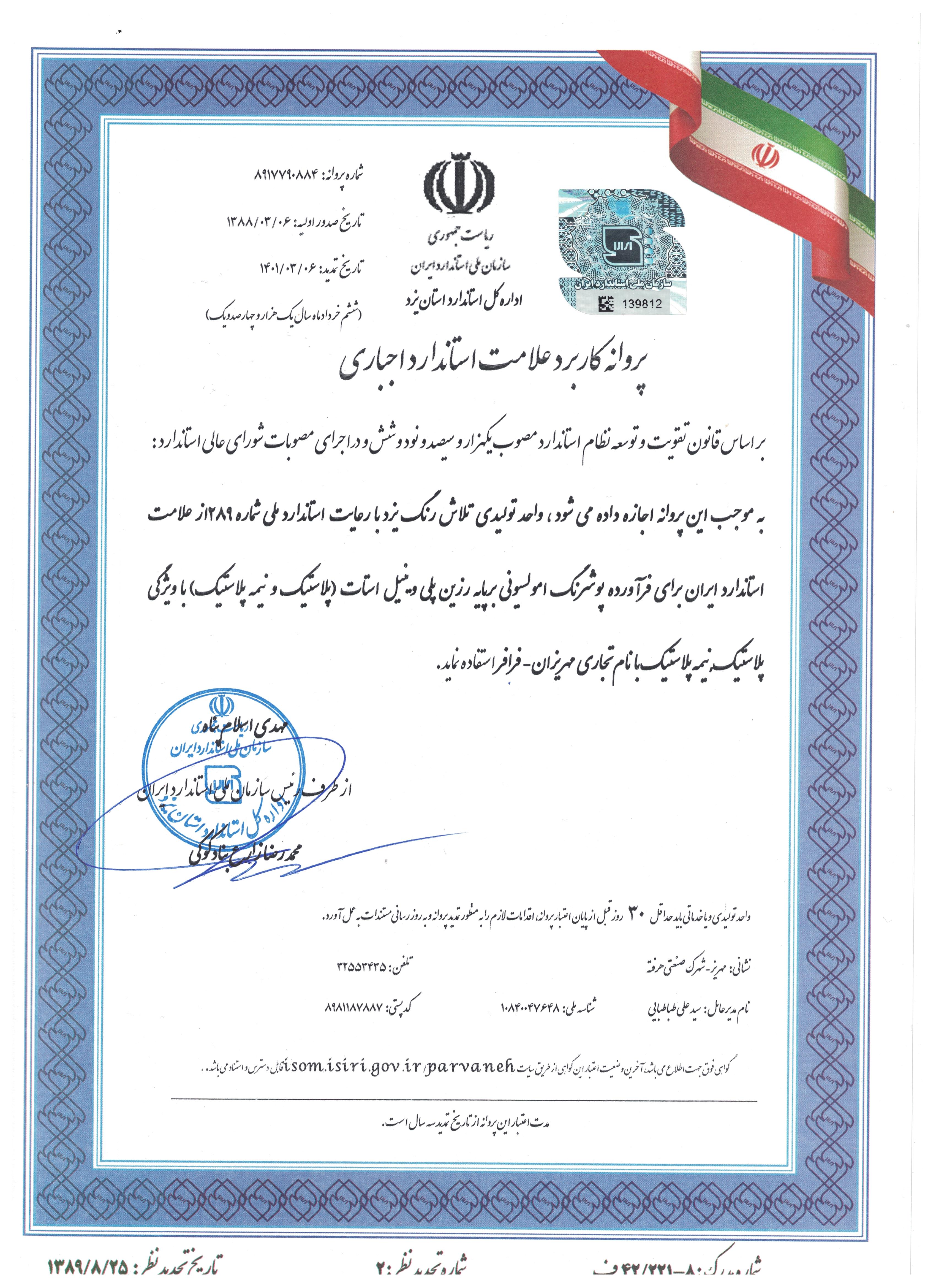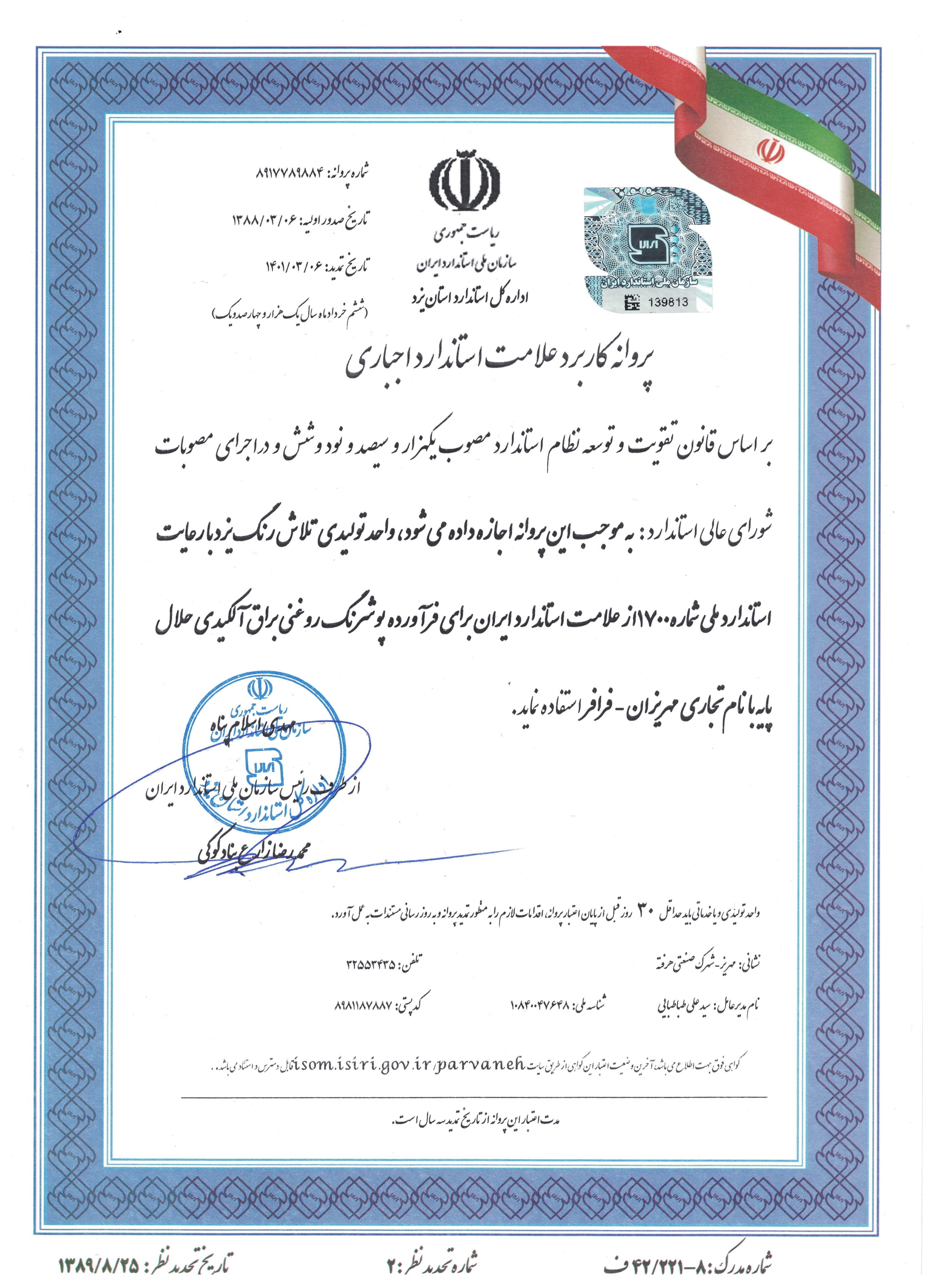 برای مشاهده هر گواهینامه یا مجوز کافیست روی تصویر مورد نظر کلیک نمایید. مجوزها و گواهی نامه های زیر حسب مورد از سازمان ها و مراکز دولتی و خصوصی ایران صادر گردیده است.